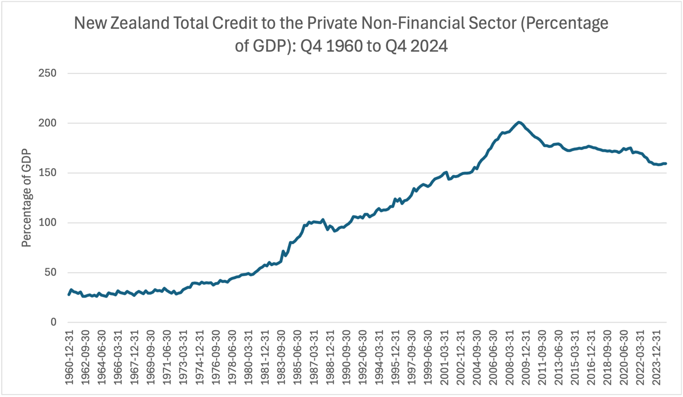 Here’s New Zealand’s total credit to the private non-financial sector (private debt) between 1960 and 2024.1 Yes – the left-hand axis is percentage of GDP. Also, see the decline after 2021 on the far right of the graph!